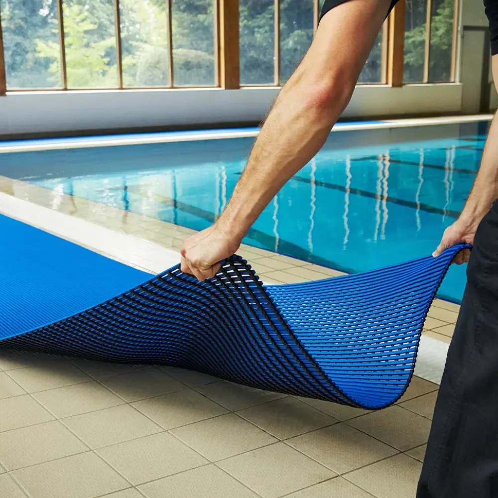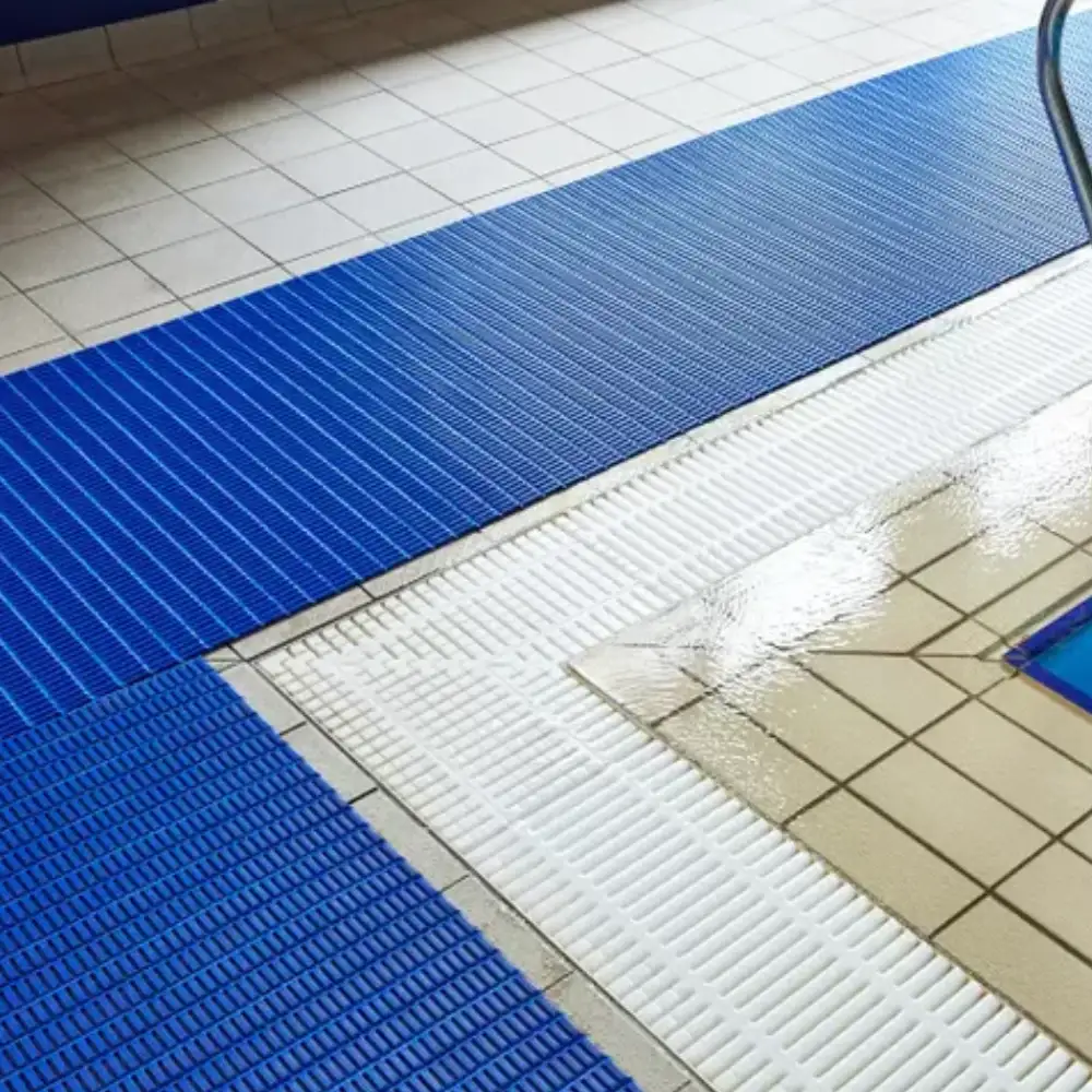 Slip-resistant mats designed to enhance safety, drainage and comfort around wet pool areas.